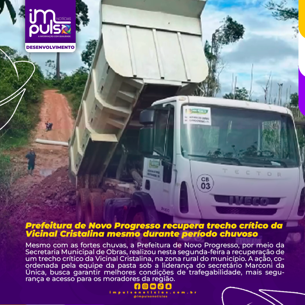 Mesmo com as fortes chuvas, a Prefeitura de Novo Progresso, por meio da Secretaria Municipal de Obras, realizou nesta segunda-feira a recuperação de um trecho crítico da Vicinal Cristalina, na zona rural do município. A ação, coordenada pela equipe da pasta sob a liderança do secretário Marconi da Única, busca garantir melhores condições de trafegabilidade, mais segurança e acesso para os moradores da região.
