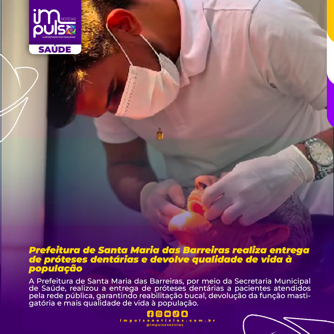 A Prefeitura de Santa Maria das Barreiras, por meio da Secretaria Municipal de Saúde, realizou a entrega de próteses dentárias a pacientes atendidos pela rede pública, garantindo reabilitação bucal, devolução da função mastigatória e mais qualidade de vida à população.