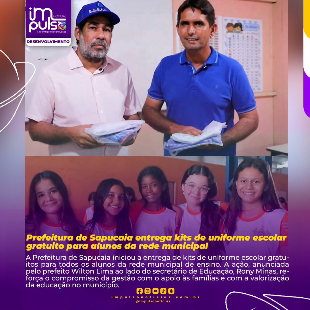 A Prefeitura de Sapucaia iniciou a entrega de kits de uniforme escolar gratuitos para todos os alunos da rede municipal de ensino. A ação, anunciada pelo prefeito Wilton Lima ao lado do secretário de Educação, Rony Minas, reforça o compromisso da gestão com o apoio às famílias e com a valorização da educação no município.