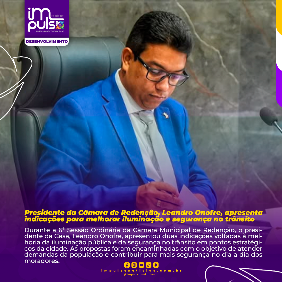 Durante a 6ª Sessão Ordinária da Câmara Municipal de Redenção, o presidente da Casa, Leandro Onofre, apresentou duas indicações voltadas à melhoria da iluminação pública e da segurança no trânsito em pontos estratégicos da cidade. As propostas foram encaminhadas com o objetivo de atender demandas da população e contribuir para mais segurança no dia a dia dos moradores.