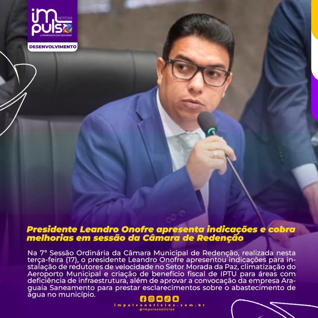 Na 7ª Sessão Ordinária da Câmara Municipal de Redenção, realizada nesta terça-feira (17), o presidente Leandro Onofre apresentou indicações para instalação de redutores de velocidade no Setor Morada da Paz, climatização do Aeroporto Municipal e criação de benefício fiscal de IPTU para áreas com deficiência de infraestrutura, além de aprovar a convocação da empresa Araguaia Saneamento para prestar esclarecimentos sobre o abastecimento de água no município.