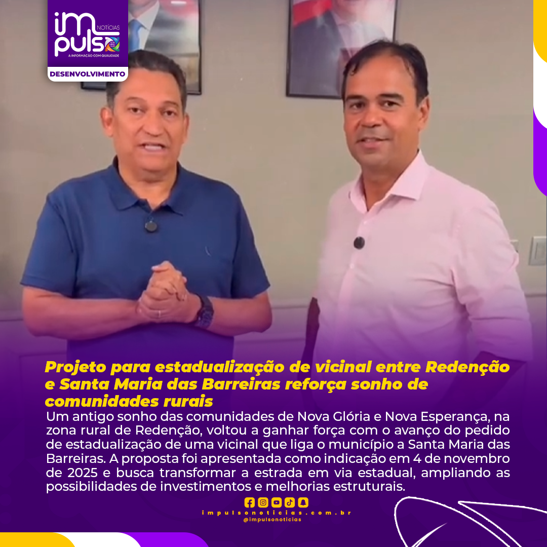 Um antigo sonho das comunidades de Nova Glória e Nova Esperança, na zona rural de Redenção, voltou a ganhar força com o avanço do pedido de estadualização de uma vicinal que liga o município a Santa Maria das Barreiras. A proposta foi apresentada como indicação em 4 de novembro de 2025 e busca transformar a estrada em via estadual, ampliando as possibilidades de investimentos e melhorias estruturais.