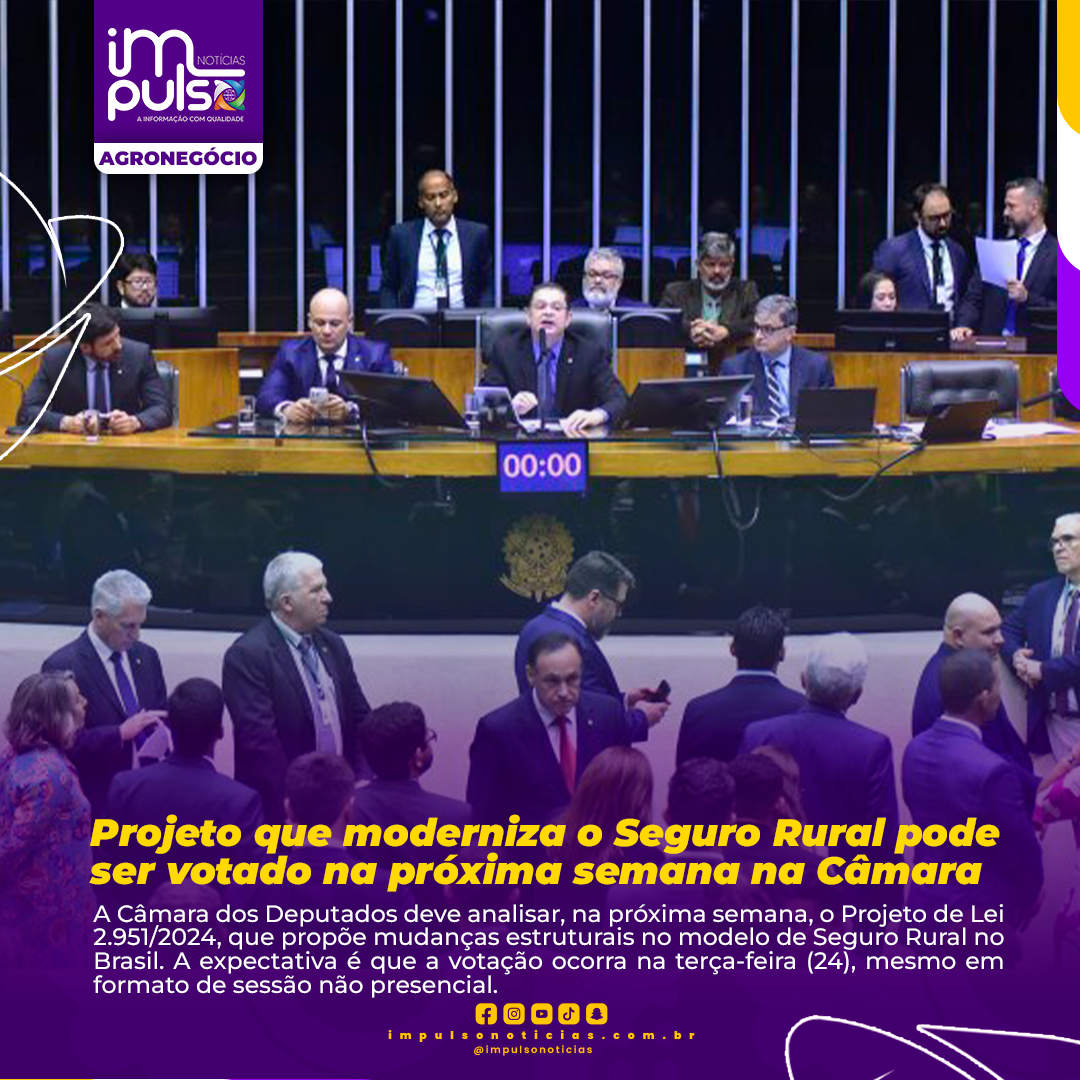 A Câmara dos Deputados deve analisar, na próxima semana, o Projeto de Lei 2.951/2024, que propõe mudanças estruturais no modelo de Seguro Rural no Brasil. A expectativa é que a votação ocorra na terça-feira (24), mesmo em formato de sessão não presencial.