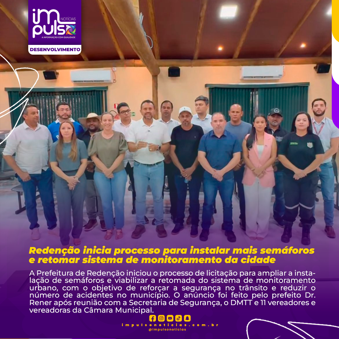 A Prefeitura de Redenção iniciou o processo de licitação para ampliar a instalação de semáforos e viabilizar a retomada do sistema de monitoramento urbano, com o objetivo de reforçar a segurança no trânsito e reduzir o número de acidentes no município. O anúncio foi feito pelo prefeito Dr. Rener após reunião com a Secretaria de Segurança, o DMTT e 11 vereadores e vereadoras da Câmara Municipal.