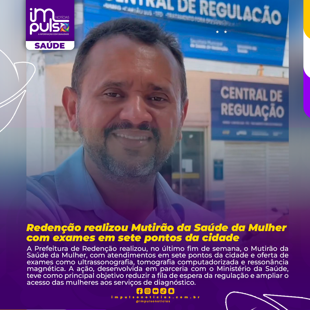 A Prefeitura de Redenção realizou, no último fim de semana, o Mutirão da Saúde da Mulher, com atendimentos em sete pontos da cidade e oferta de exames como ultrassonografia, tomografia computadorizada e ressonância magnética. A ação, desenvolvida em parceria com o Ministério da Saúde, teve como principal objetivo reduzir a fila de espera da regulação e ampliar o acesso das mulheres aos serviços de diagnóstico.