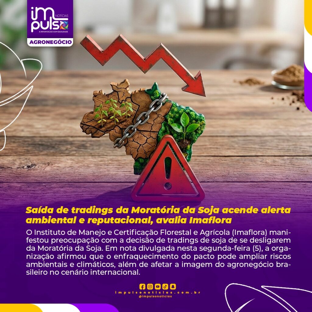 O Instituto de Manejo e Certificação Florestal e Agrícola (Imaflora) manifestou preocupação com a decisão de tradings de soja de se desligarem da Moratória da Soja. Em nota divulgada nesta segunda-feira (5), a organização afirmou que o enfraquecimento do pacto pode ampliar riscos ambientais e climáticos, além de afetar a imagem do agronegócio brasileiro no cenário internacional.