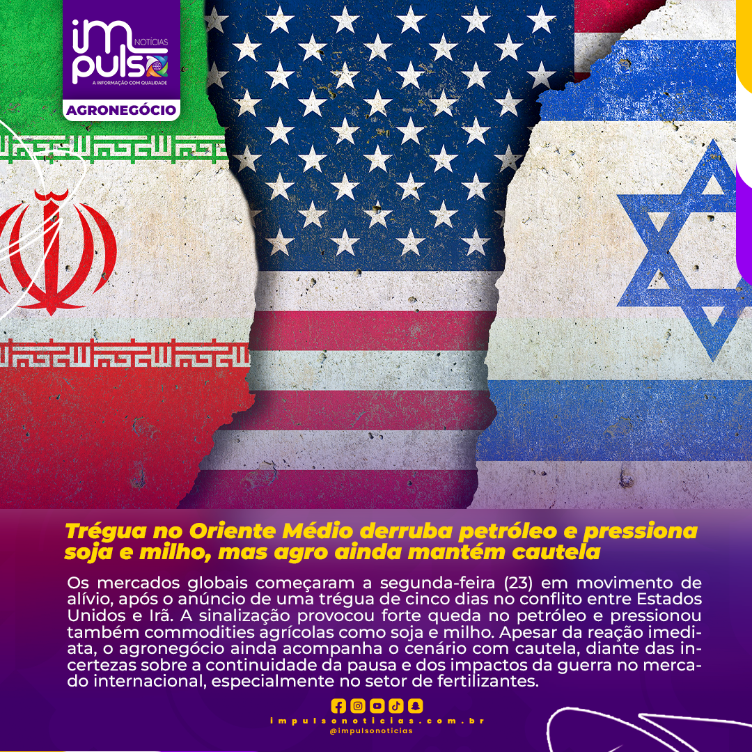 Os mercados globais começaram a segunda-feira (23) em movimento de alívio, após o anúncio de uma trégua de cinco dias no conflito entre Estados Unidos e Irã. A sinalização provocou forte queda no petróleo e pressionou também commodities agrícolas como soja e milho. Apesar da reação imediata, o agronegócio ainda acompanha o cenário com cautela, diante das incertezas sobre a continuidade da pausa e dos impactos da guerra no mercado internacional, especialmente no setor de fertilizantes.