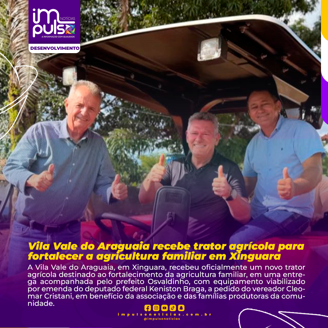 A Vila Vale do Araguaia, em Xinguara, recebeu oficialmente um novo trator agrícola destinado ao fortalecimento da agricultura familiar, em uma entrega acompanhada pelo prefeito Osvaldinho, com equipamento viabilizado por emenda do deputado federal Keniston Braga, a pedido do vereador Cleomar Cristani, em benefício da associação e das famílias produtoras da comunidade.