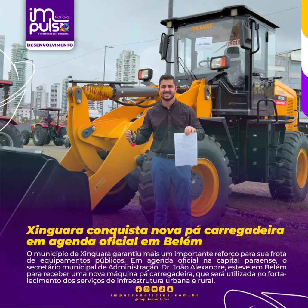 O município de Xinguara garantiu mais um importante reforço para sua frota de equipamentos públicos. Em agenda oficial na capital paraense, o secretário municipal de Administração, Dr. João Alexandre, esteve em Belém para receber uma nova máquina pá carregadeira, que será utilizada no fortalecimento dos serviços de infraestrutura urbana e rural.